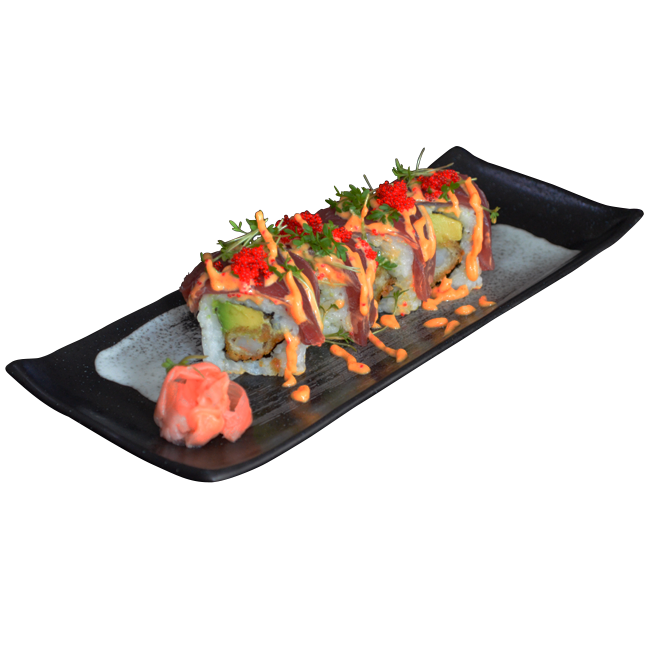 mit panierten Garnelen, Avo, Thunfisch, Spicy Mayo und Fischrogen