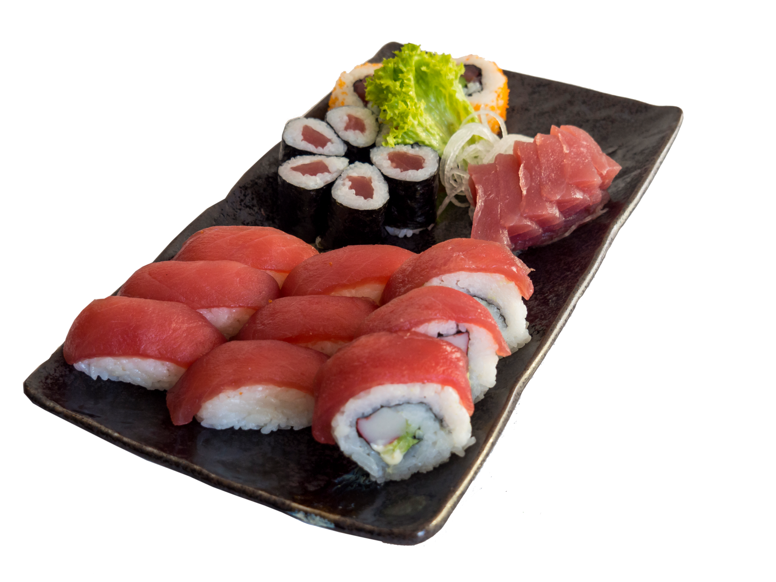 (Mi. 30,90 €) 6x Tekka Maki 6x Maguro Nigiri 2x Inside-Out mit Thunfisch 2x Boston Roll 6x Thunfisch Sashimi
