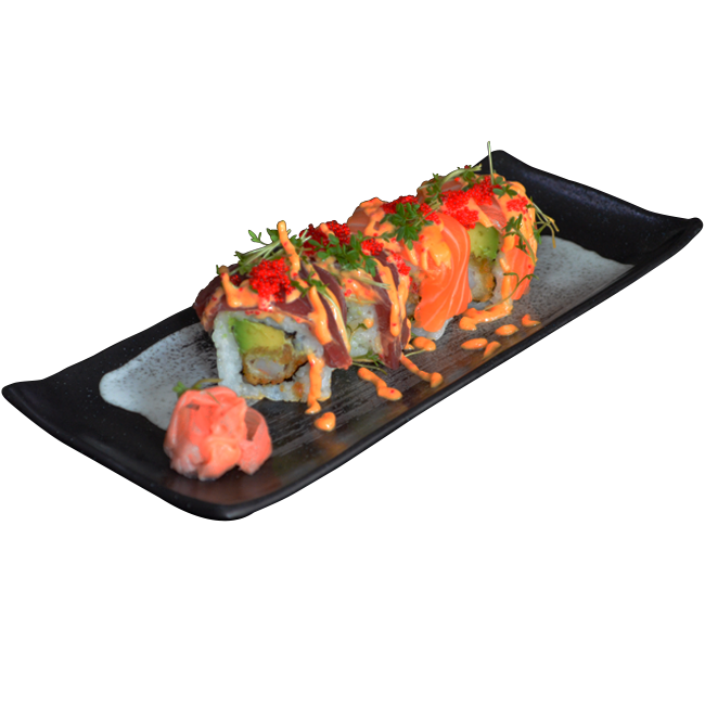mit panierten Garnelen, Avo, Lachs, Thunfisch, Spicy Mayo und Fischrogen