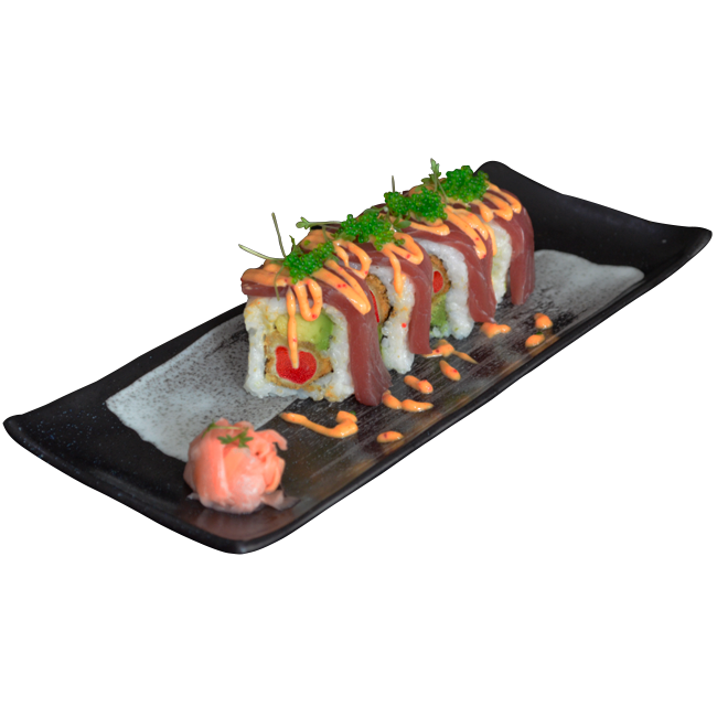 mit panierter Paprika, Avo, Thunfisch, Spicy Mayo und Fischrogen